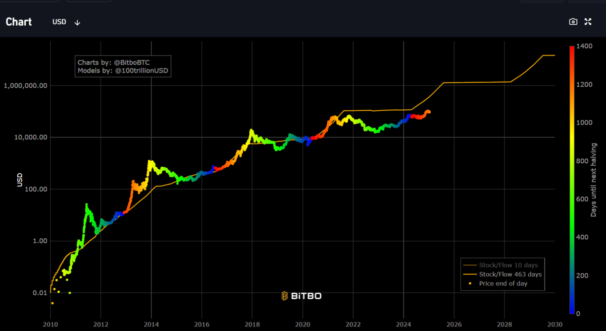 ストックフロー比率のチャートはアメリカのサイトではよく見かける。説明のためサイトから引用する。図のオレンジのラインがBTCのストックフロー比率を表している。BTCの価格が概ねこのライン近傍で動いていることがわかる。このラインがどのようなロジックで描かれているのか調べてみた。