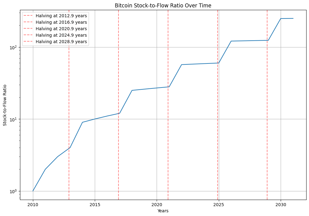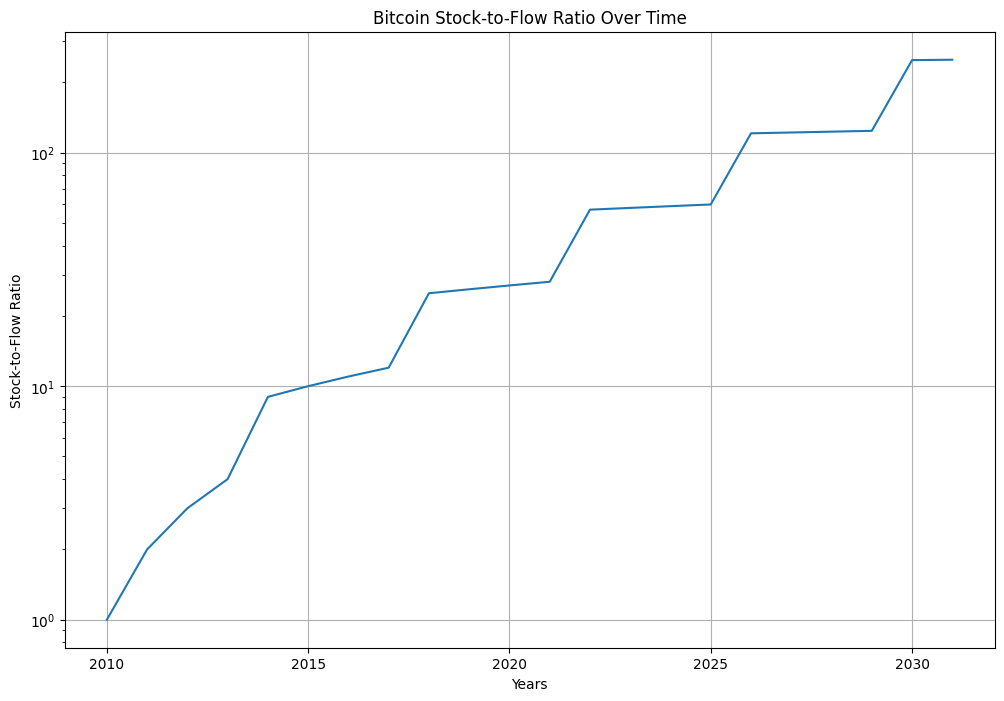 ビットコイン(以下BTC)のストックフロー比率を求め、横軸を期間(20年間)とし、縦軸をストックフロー比率としてPythonでグラフを描いてください